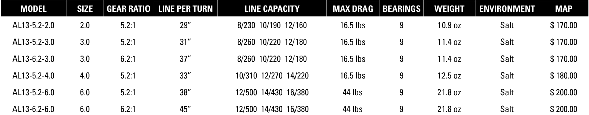 - 13 Fishing delivers the AL13 in Speed and Power Gear Ratio options in several sizes.